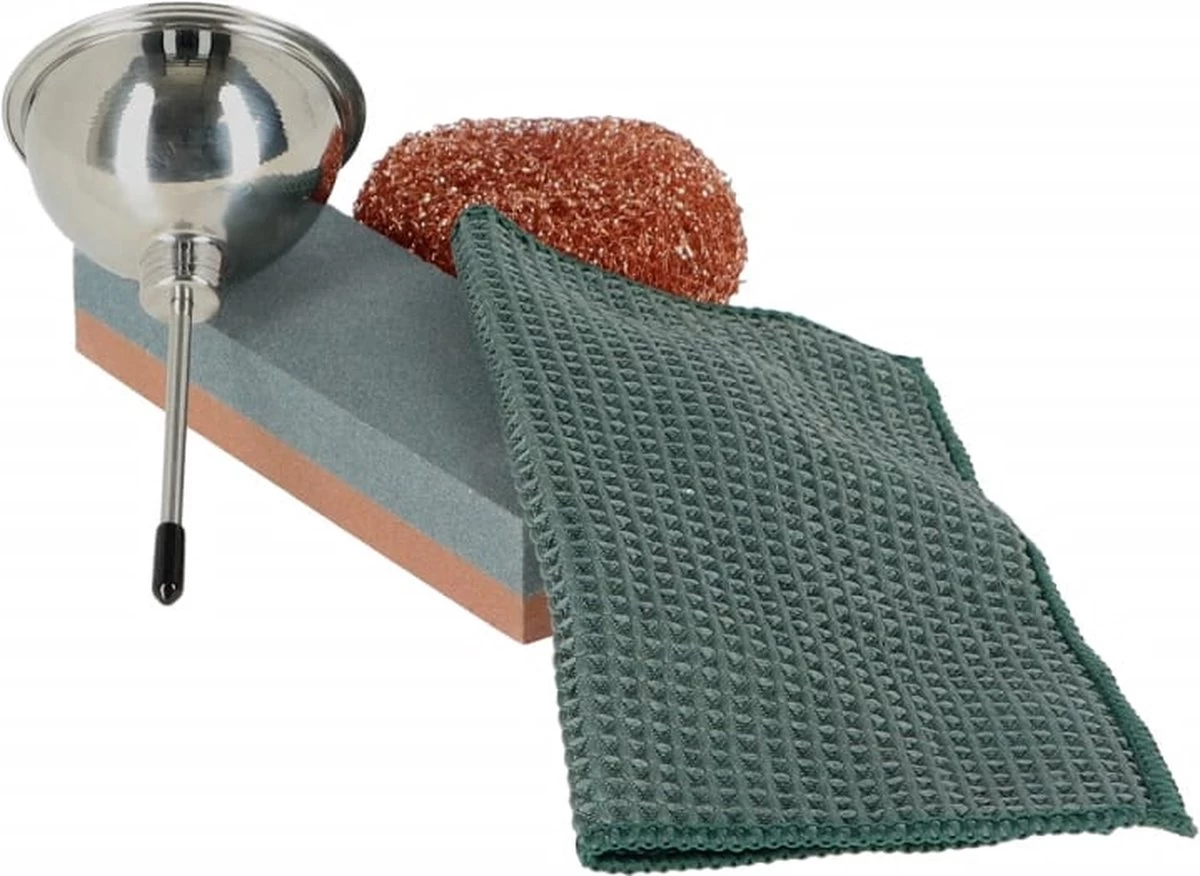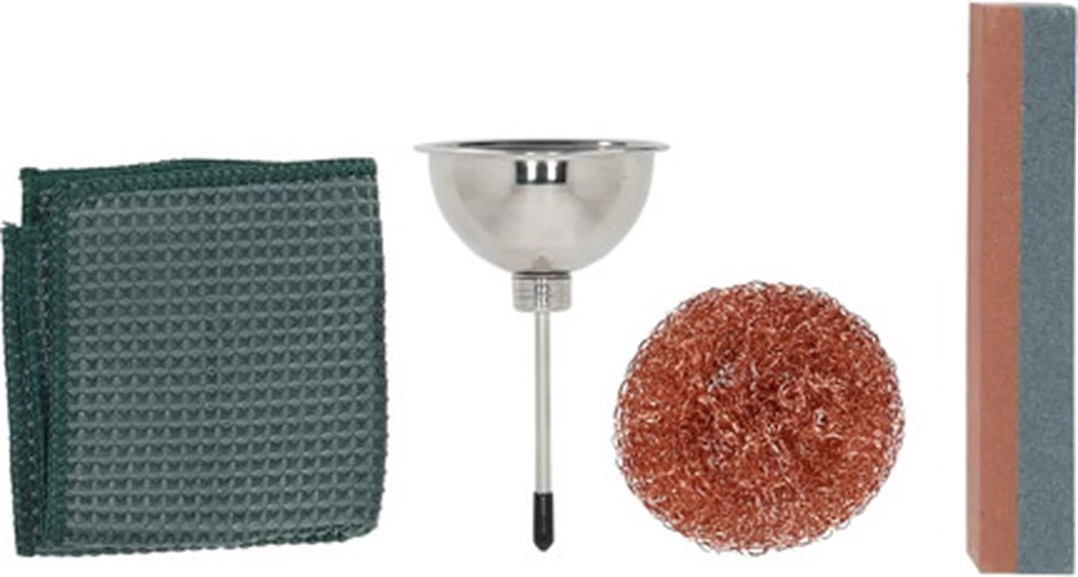 - se compose d’une pierre à aiguiser, de laine de cuivre, d’une burette d’huile en acier inoxydable et d’un chiffon
