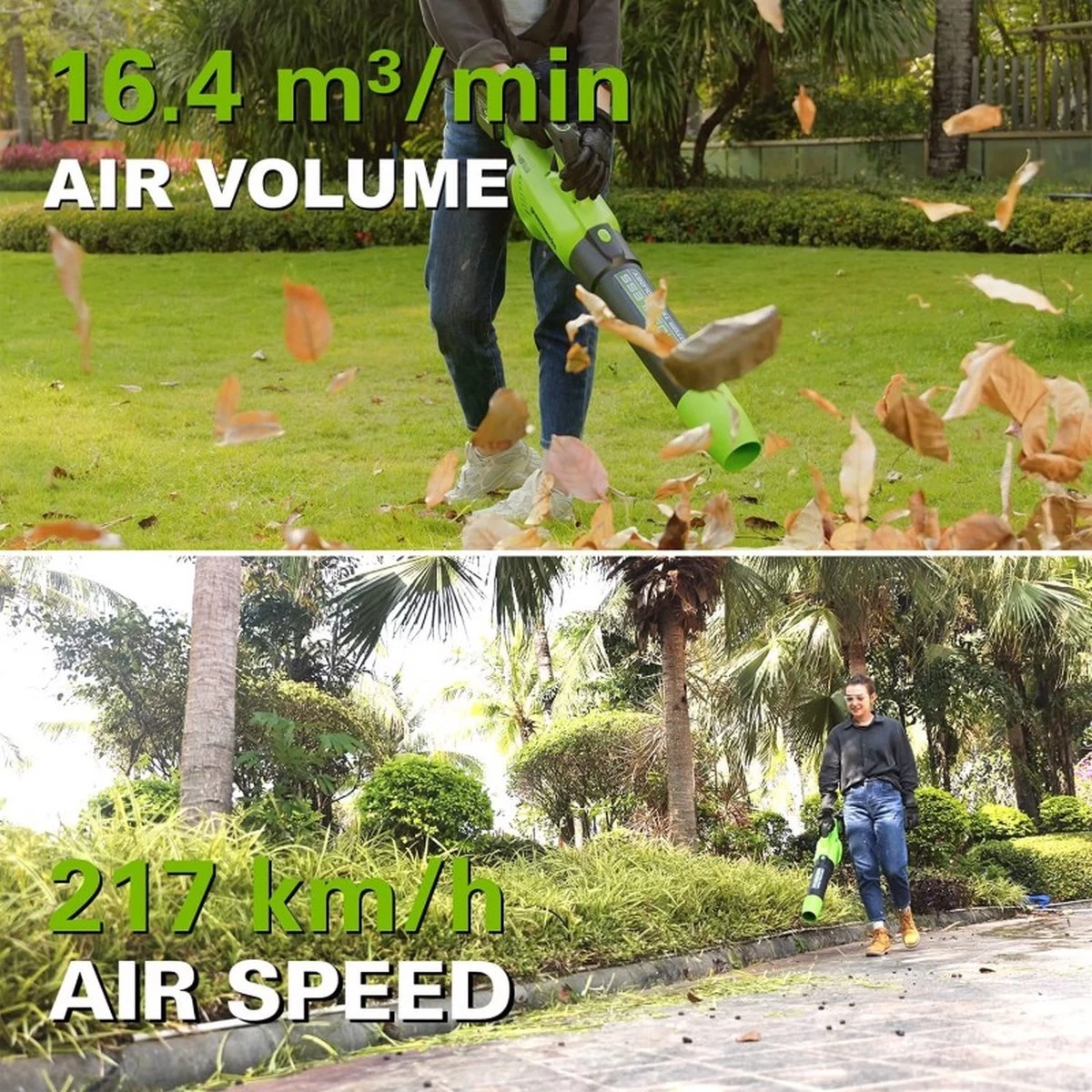 La vitesse de soufflage est de 217 km/h et le volume d’air que vous déplacez est de 16,4 m³/min. La vitesse de soufflage est réglable de manière variable. La vitesse de soufflage d’un souffleur de feuilles est importante, mais il est également facile d’augmenter par nous en tant que fabricant en rétrécissant le tube de soufflage à l’extrémité. Cependant, la surface que vous soufflez devient alors plus petite et c’est pourquoi le volume d’air est également important (indiqué en m³). C’est peut-être pour cela que le volume d’air est encore plus important que la vitesse de soufflage. Plus le volume d’air est important, plus la zone sur laquelle vous pouvez travailler simultanément est grande.