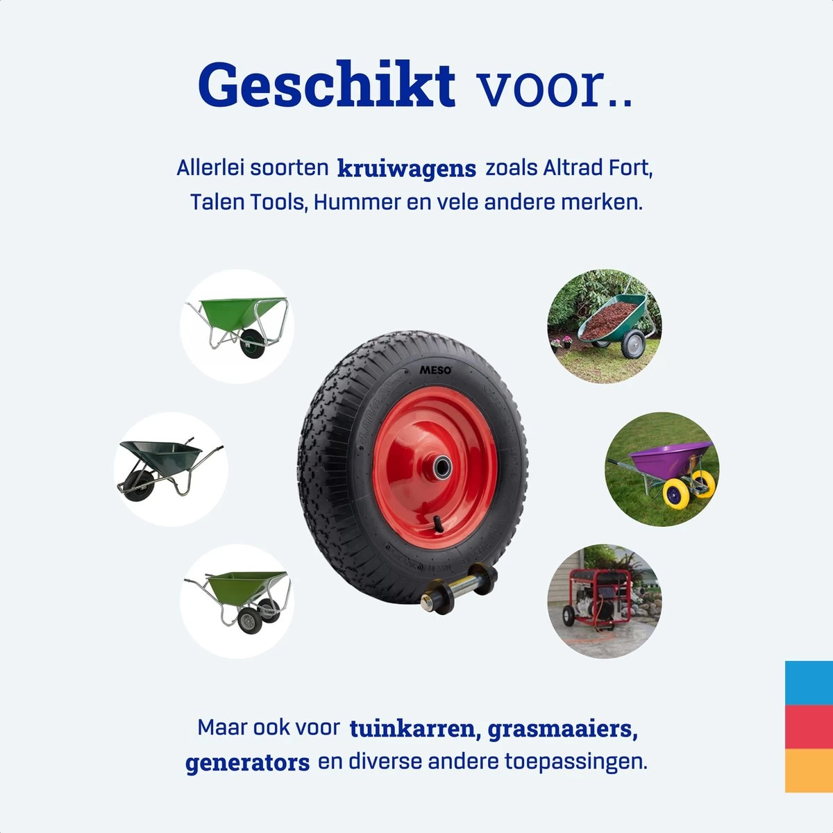 Vérifiez la taille de l’ancien pneu avant de commander. Généralement, ce sera 4.80/4.00-8. La capacité de charge est de 200 kg. Nous vous recommandons de ranger la brouette vide après utilisation pour éviter que les pneus ne se déforment inutilement en raison d’un stationnement prolongé.