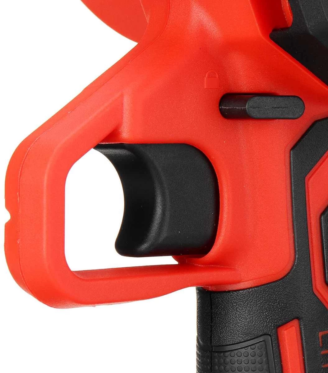 Étant donné que la tronçonneuse est plus petite qu’une tronçonneuse normale, elle deviendra également plus attrayante pour les jeunes enfants si elle n’est pas rangée correctement. Il y a un interrupteur spécial sur l’appareil en tant que dispositif de sécurité pour enfants, nous veillons donc à ce qu’il soit un peu plus difficile pour un enfant d’allumer accidentellement la scie.