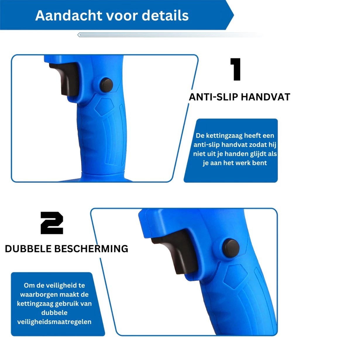 La scie fonctionne comme n’importe quel autre outil électrique, elle dispose d’un bouton marche/arrêt normal et d’un interrupteur de sécurité. Cela garantit que vous pouvez utiliser la tronçonneuse rapidement et que le travail avec la mini-scie est également facile.