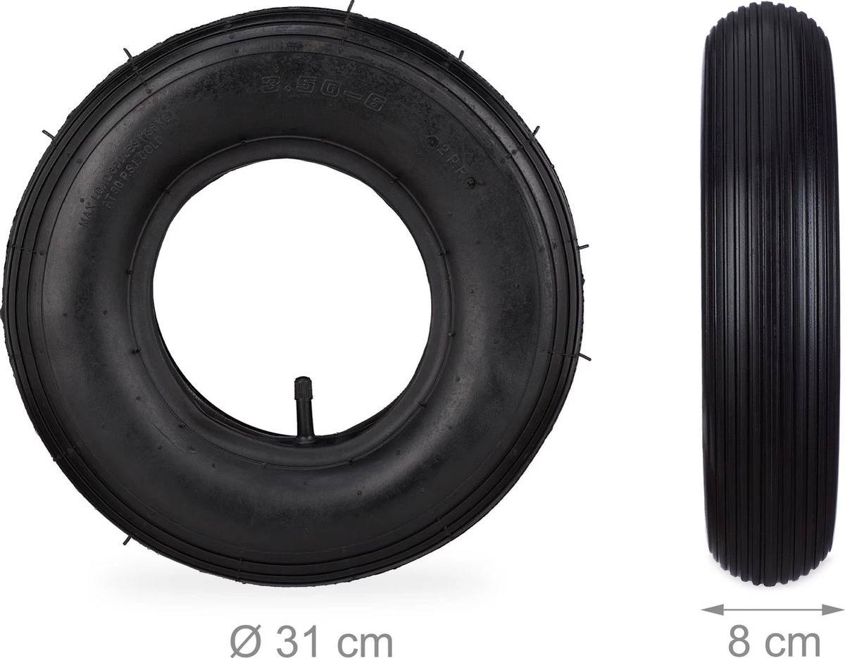 Vous êtes juste sur la route avec une brouette très chargée tandis qu’un pneu crevé vous rend la vie misérable. Avec cet ensemble de pneus et de chambre à air, vous êtes sauvé dans ces cas et vous pouvez réagir immédiatement. Les pneus de brouette 3.50-6 « sans jante sont un bon remplacement pour toutes les brouettes, chariots à main ou charrettes à main standard. La chambre à air avec valve de voiture peut être gonflée en un rien de temps avec un compresseur ou à la station-service. Remarque: lors du gonflage, respecter la pression d’air maximale de 2 bar. Pneu de brouette en lot de 2 en détail – Taille du pneu: 3,50-6 pouces Dimensions par pneu D x L: environ 31 x 8 cm – Max. Pression d’air 2 bar – Capacité de charge chacun environ 136 kg – Poids environ 1 kg par jeu – Matériau: caoutchouc – Couleur: Zwart Pneu de secours avec chambre à air – Chambre à air avec valve de voiture pour un gonflage facile – Bande de roulement avec profil pour une conduite facile – Kit de rechange avec 2 x pneu et chambre à air – En cas de crevaison, pneu toujours prêt – Accessoire de pneu pneumatique pour brouettes, chariots et plus La livraison comprend – 2 x pneu de brouette – 2 x chambre à air de brouette (vide) – La Décoration est non inclus dans la livraison