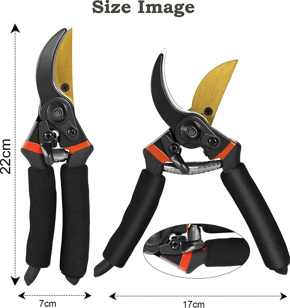 - Ressort de qualité : le ressort est fabriqué en acier de haute qualité, pas de déformation, pas de casse. Verrou de sécurité à une main pour plus de sécurité. La forme du sécateur est conçue de manière à réduire considérablement la fatigue des mains, même après une utilisation prolongée.