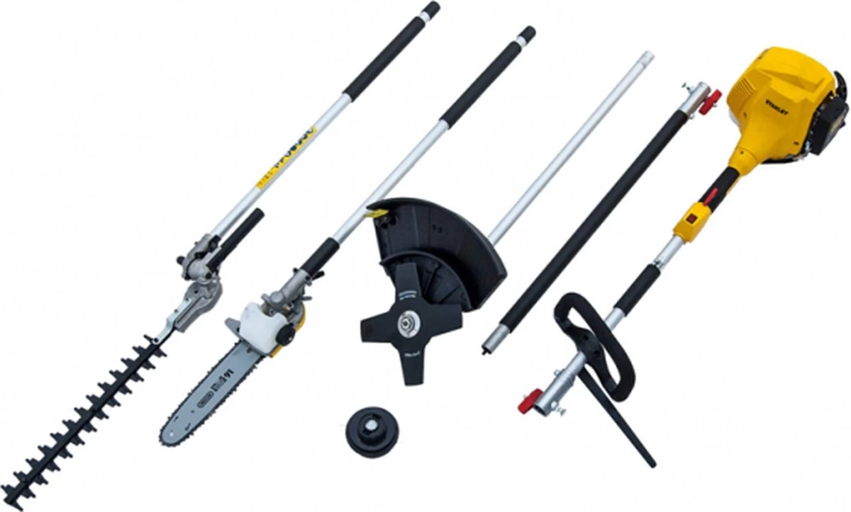 Outil multi fonction 4 en 1 thermique : coupe bordure – Taille haie – Elageuse – Débrouissalleuse – Moteur 26 cm³ JETFORCE 2 temps (Mélange SP98/huile 4%) 1 cv – Carburateur Walbro – Réservoir 0,4 L – Coupe bordure fil nylon (2,0mm) de coupe max 430 mm – Lame débroussialleuse 4 dents (230 mm diam – 1,6 mm épaisseur).